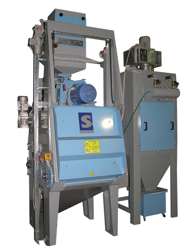 Zařízení je konstruováno pro tryskání ocelových, litinových nebo nerezových odlitků, výkovků, tepelně zpracovaných ocelových dílů, svařenců, k odstraňování rzi, k odjehlování, zpevňování povrchu atd. Použitý princip tryskání: vrhání kovového tryskacího materiálu na tryskané obrobky, tryskací materiál je unášen pomocí lopatek metacího kola (turbíny).